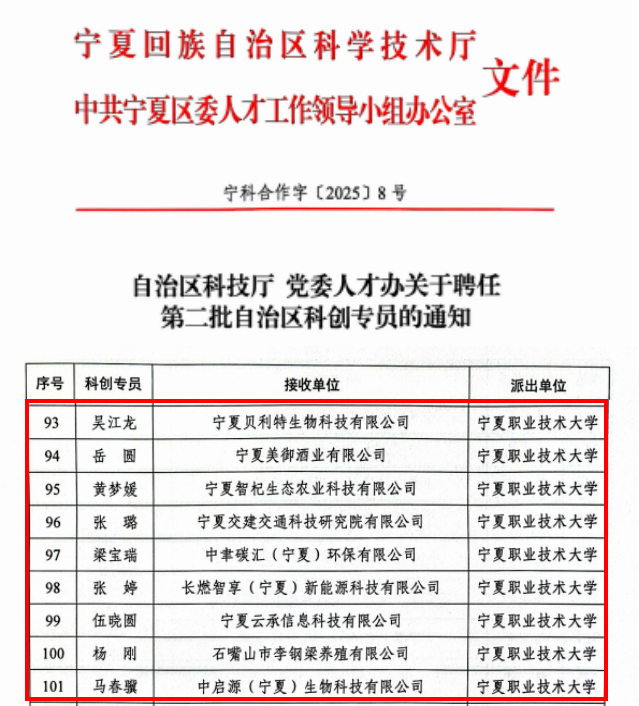 为促进科技创新与产业创新深度融合,进一步激发科技人才创新活力,强化企业在科技创新中的主体地位,在自治区科技厅与自治区党委人才办携手推动的第二批自治区科创专员选聘工作中,我校9位老师凭借扎实的专业知识及丰富的科研经验成功入选。这不仅是对我校教师个人能力的高度认可,更是对我校长期以来在科技创新和人才队伍建设方面所取得成绩的充分肯定。